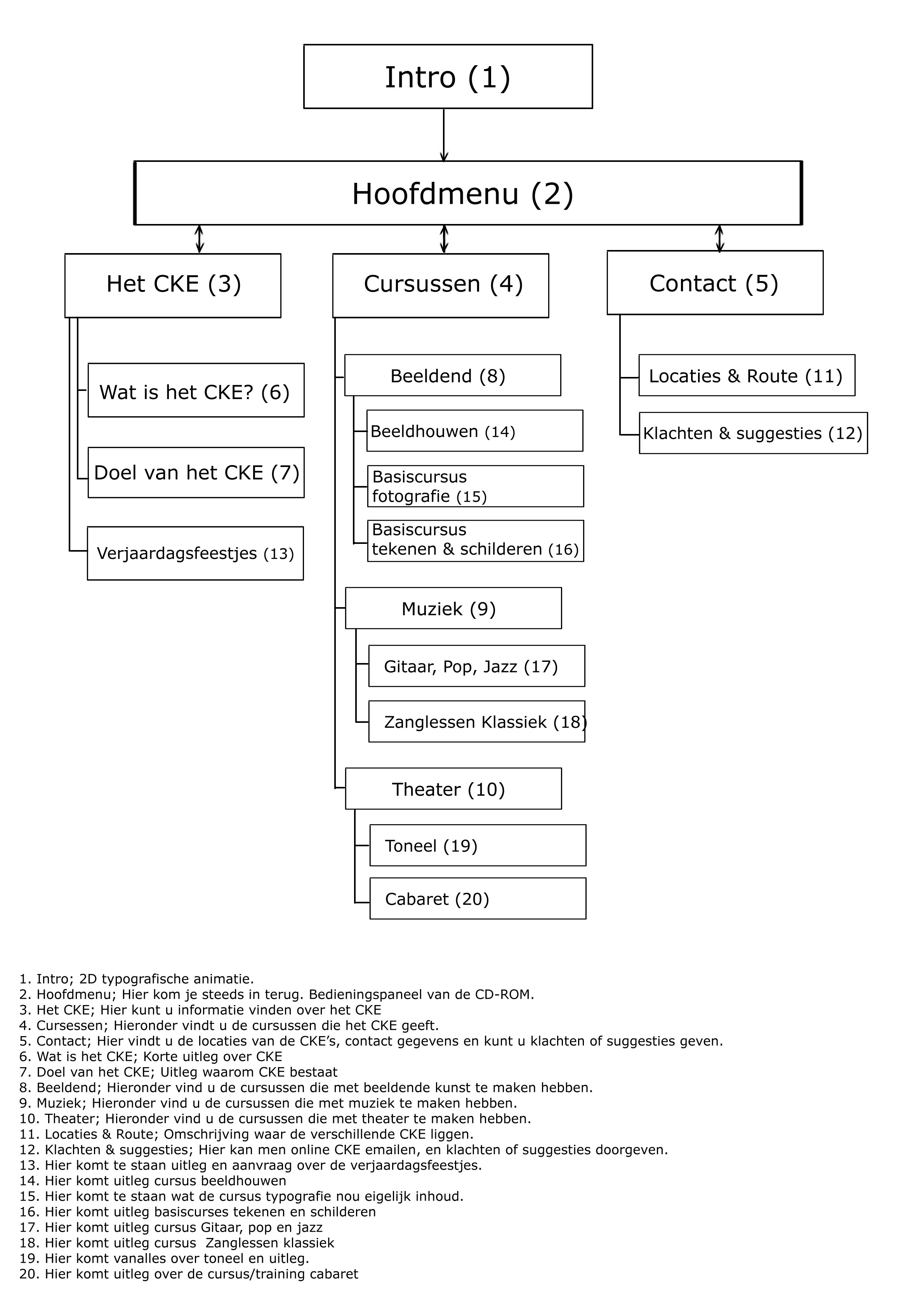 Leren: Om een CD-ROM te maken moet je weten welke onderdelen je hebt en onderwerpen en hoe je gaat linken, dat maak je in een flowchart.